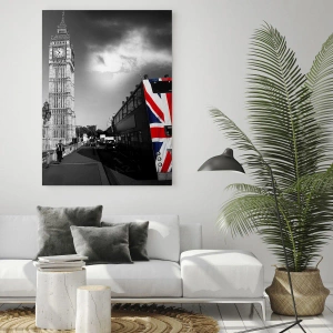 - A festmény a Big Ben fekete-fehér képét és egy brit zászlót viselő buszt ábrázol. A hangulatos jelenet a klasszikus építészetet dinamikus kortárs csavarral ötvözi.