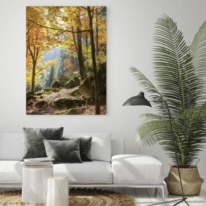 Az "Őszi erdő napsugarakkal és kövekkel" című kompozíció kiváló választás azok számára, akik szeretik a természetet és annak változó színeit. A festmény a béke, az inspiráció és a természettel való kapcsolat légkörét hozza el. Ez a dekoráció tökéletesen illik nappalikba, hálószobákba és irodákba, pihentető és nyugodt helyet teremtve.