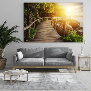 Üveg kép - Egy fa ösvény a fák között a tengerparton, naplemente fényében - 70x50cm - Újabb kanyar, újabb csoda - Modern fali dekoráció nappalihoz és hálószobához ARTTOR