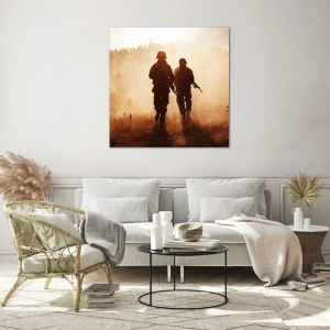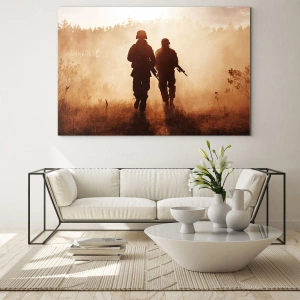 Ez a műalkotás gyönyörűen illeszkedik ipari, modern vagy loft stílusú enteriőrökbe. A lenyugvó nap meleg fénye és a katonák sziluettjei közötti kontraszt lenyűgöző vizuális hatást kelt, amely vonzza a figyelmet és inspirál. Tökéletes választás azok számára, akik ki szeretnék fejezni a katonai témák iránti szenvedélyüket, vagy értékelik a merész faldekorációkat.