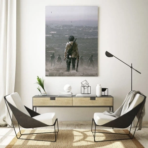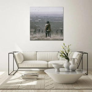 Üveg kép - Egy puskával felfegyverzett alak egy közeledő csoport sötét tájában - 70x50cm - Utolsó igazságos? - Modern fali dekoráció nappalihoz és hálószobához ARTTOR
