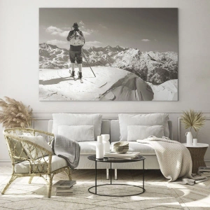 Üveg kép - Síelő egy hegycsúcson fekete-fehérben - 70x50cm - És a hegyek ugyanazok - Modern fali dekoráció nappalihoz és hálószobához ARTTOR