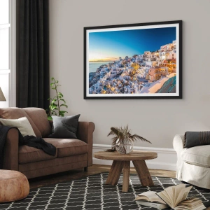 Poszter fehér keretben - Kilátás a kivilágított házakra Santorini-n naplementekor - 50x70cm - A görögség lényege - Modern fali dekoráció nappalihoz és hálószobához ARTTOR