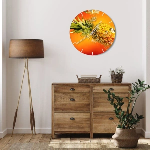 Falióra, Óra - Egy ananász, vízbe merülve, narancssárga színátmenetes háttér előtt. - 30x30cm - Trópusi lédús frissesség - Modern fali dekoráció nappalihoz, konyhához és hálószobához ARTTOR