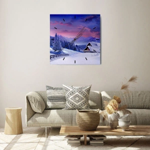 Falióra, Óra - Téli táj egy házikóval a hegyekben naplementekor - 30x30cm - Csendes éj - Modern fali dekoráció nappalihoz, konyhához és hálószobához ARTTOR