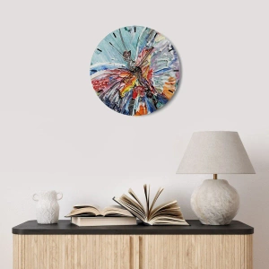 Egyedi dizájnú falióra, amely egy absztrakt pillangó motívumot ábrázol intenzív, élénk színekben. Ez a művészi díszítőelem energiát és egyedi karaktert visz a belső térbe, kifejezőbbé és egyedibbé téve azt.