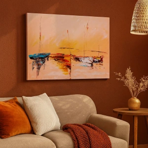 Vászonkép - Színes hajók nyugodt vízen naplementekor - 70x50cm - Egy este a kikötőben - Modern fali dekoráció nappalihoz és hálószobához ARTTOR
