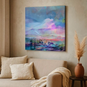 - Egy művészi hegyi táj pasztellszínű égbolttal és egy völgyben megbúvó kis faluval. Ez a festmény tele van harmóniával és nyugalommal, tökéletes a természet ihlette belső terek díszítésére.