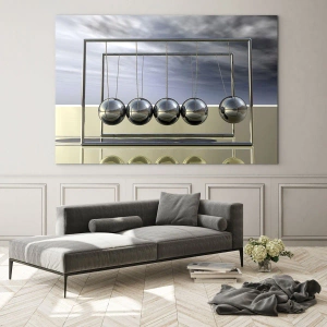 - A festmény minimalista dizájnban ábrázol fémből készült Newton-gömböket, amelyek visszaverik a fényt és harmonikus hatást keltenek. Tökéletes dekoráció a modern és elegáns stílust értékelő enteriőrökbe.