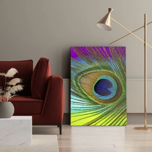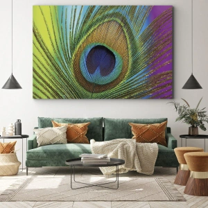 - Ez a festmény egy élénk színű pávatoll közeli képét ábrázolja. Ez a rendkívül dekoratív és elegáns motívum tökéletes a modern belső terekbe.
