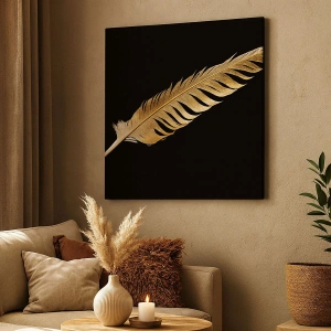 - Egy fekete háttér előtt elhelyezkedő arany toll elegáns és minimalista kompozíciót alkot. A festmény tökéletesen illeszkedik a modern enteriőrökbe, luxus jelleget és egyedi stílust kölcsönözve azoknak.