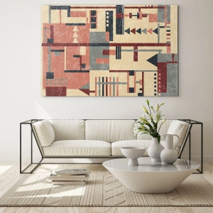 • Egy absztrakt festmény geometrikus mintával bézs, piros és szürke árnyalatokban, amely tökéletes modern és minimalista belső terekbe.