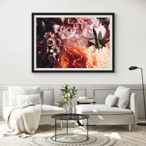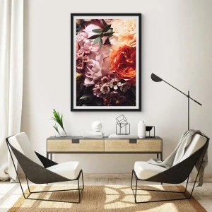 Poszter fehér keretben - Egy virágcsokor közeli képe rózsaszín, narancs és krémszínű árnyalatokban. - 50x70cm - Szépségbe burkolózva - Modern fali dekoráció nappalihoz és hálószobához ARTTOR