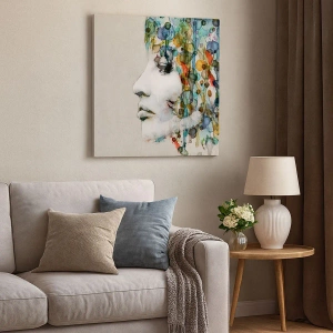 - Egy művészi kompozíció, amely egy női profilt ábrázol absztrakt akvarell színekkel, amelyek az expresszivitást a finomsággal ötvözik. Ideális dekorációs kiegészítő, amely harmóniát és inspirációt visz bármilyen enteriőrbe.
