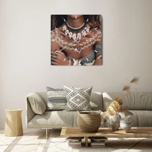 A "Talizmánok, nőiesség rituáléi" egy kifejező és szimbolikus motívum, amely egy etnikai ékszerekkel és henna mintákkal díszített nő dekoratív portréját mutatja be. A kompozíció részletességével és üzenetének intenzitásával gyönyörködtet. Az előtérben egy nő látható, akinek a nyakát és vállát gazdag etnikai ékszerek díszítik, amelyeket henna tetoválásra emlékeztető finom díszítések kombinálnak. Az egész darab természetes színekben pompázik, hangsúlyozva az ábrázolás organikus jellegét.