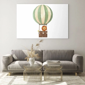 Üvegkép "Leon utazásai" egy mesebeli illusztráció egy barátságos oroszlánról, amint egy lufiban repül egy fehér térben. A pasztellszínű kép tökéletesen illeszkedik egy gyerekszoba hangulatába.