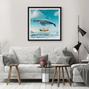 Poszter fehér keretben - Egy fantasztikus kép egy bálnáról, amint egy repülőgépet emel a felhők fölé. - 50x70cm - Miért is ne? - Modern fali dekoráció nappalihoz és hálószobához ARTTOR