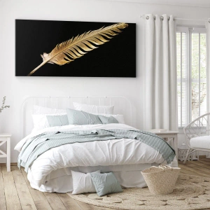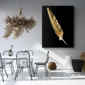 - Egy fekete háttér előtt elhelyezkedő arany toll elegáns és minimalista kompozíciót alkot. A festmény tökéletesen illeszkedik a modern enteriőrökbe, luxus jelleget és egyedi stílust kölcsönözve azoknak.
