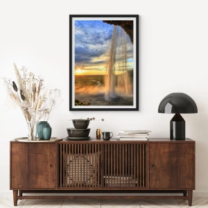 Poszter fehér keretben - Egy vízesés a lenyugvó nap fényében, egy tájkép hátterében - 50x70cm - Cseppfátyol mögötti világ - Modern fali dekoráció nappalihoz és hálószobához ARTTOR