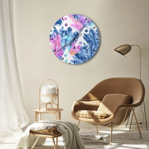 - Színes tollakból készült akvarell motívummal díszített falióra. Diszkrét és stílusos dekoráció, amely tökéletes elegáns és művészi hangulatú enteriőrökbe.