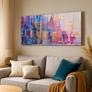 - A festmény egy színes városképet ábrázol a vízen tükröződő képekkel, megragadva egy modern metropolisz örömét és energiáját. Tökéletes kiegészítője bármilyen modern enteriőrnek.