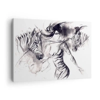 Vászonkép - Egy nő dinamikus táncot jár zebrákkal fekete-fehér esztétikában - 70x50cm - Tánc a zebrákkal - Modern fali dekoráció nappalihoz és hálószobához ARTTOR