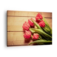 Vászonkép - Egy csokor rózsaszín tulipán fából készült háttéren - 70x50cm - Tavaszi vallomás - Modern fali dekoráció nappalihoz és hálószobához ARTTOR