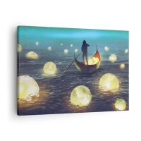 Vászonkép - Egy alak egy csónakban, körülvéve világító gömbökkel a vízen - 70x50cm - Olyan dolgok, amelyekről a filozófusok soha nem álmodtak - Modern fali dekoráció nappalihoz és hálószobához ARTTOR