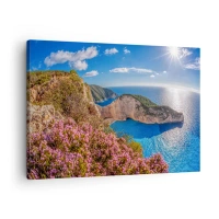 Vászonkép - Egy virágos szikla, türkizkék tenger és napsütötte görög táj - 70x50cm - Nagyszerű görög nyaralásom - Modern fali dekoráció nappalihoz és hálószobához ARTTOR