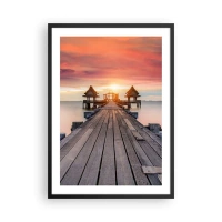Poszter fehér keretben - Egy fából készült móló, a háttérben a víz felett lenyugvó nappal - 50x70cm - Nyugat keleten - Modern fali dekoráció nappalihoz és hálószobához ARTTOR