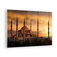 Üveg kép - A Kék Mecset a naplemente hátterében - 70x50cm - Isten hatalmas - Modern fali dekoráció nappalihoz és hálószobához ARTTOR