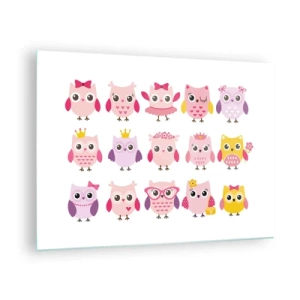 Üveg kép - Színes baglyok különböző mintákban fehér alapon - 70x50cm - Egyik édesebb, mint a másik - Modern fali dekoráció nappalihoz és hálószobához ARTTOR