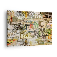 Vászonkép - Újságok és plakátok töredékeinek kollázsa művészi stílusban. - 70x50cm - Ej, történik… - Modern fali dekoráció nappalihoz és hálószobához ARTTOR