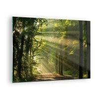 Üveg kép - Egy erdei ösvény, melyet a nap sugarai világítanak meg - 70x50cm - Erdei pillanat - Modern fali dekoráció nappalihoz és hálószobához ARTTOR