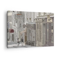 Vászonkép - Illusztráció egy városi utcáról kávézókkal és üzletekkel - 70x50cm - Városi örömök - Modern fali dekoráció nappalihoz és hálószobához ARTTOR