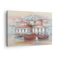 Vászonkép - Színes hajók és festői épületek a vízparton pasztell árnyalatokban - 70x50cm - Boldog kisváros - Modern fali dekoráció nappalihoz és hálószobához ARTTOR