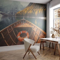 Fotótapéta Standard Eco - Kilátás egy fából készült csónakból egy hegyekkel és erdővel körülvett tóra - 100x70cm - Hegyi kirándulás - Modern fali dekoráció nappalihoz és hálószobához ARTTOR