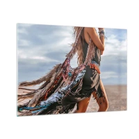 Üveg kép - Bohém stílusú nő tollakkal és dekorációkkal sivatagi háttér előtt - 70x50cm - Sámán párja - Modern fali dekoráció nappalihoz és hálószobához ARTTOR