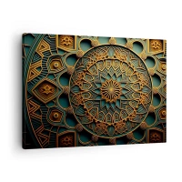 Vászonkép - Gazdag részletekkel díszített, türkiz alapon arany mandala. - 70x50cm - Egy arab éghajlaton - Modern fali dekoráció nappalihoz és hálószobához ARTTOR