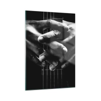Poszter fehér keretben - Kezek összekulcsolva a fekete-fehér gitár húrjain - 50x70cm - Művész imája - Modern fali dekoráció nappalihoz és hálószobához ARTTOR
