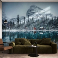 Fotótapéta Standard Eco - Egy hófödte erdő és egy hegyi házikó egy türkizkék tó mellett - 100x70cm - Kanadai elvonulás - Modern fali dekoráció nappalihoz és hálószobához ARTTOR