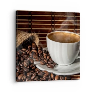 Falióra, Óra - Egy csésze kávé és szétszórt bab bambusz alapon - 30x30cm - A szén feketesége, a borostyán tisztasága - Modern fali dekoráció nappalihoz, konyhához és hálószobához ARTTOR