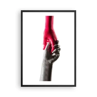 Poszter fehér keretben - Szimbolikus kezek piros és ezüst színben fehér alapon - 50x70cm - Együtt, bár mások - Modern fali dekoráció nappalihoz és hálószobához ARTTOR