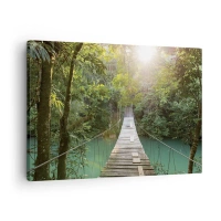 Vászonkép - Egy függőhíd egy trópusi erdőben, amelyet napfény világít meg. - 70x50cm - Az azúrkék vízen át az azúrkék erdőbe - Modern fali dekoráció nappalihoz és hálószobához ARTTOR