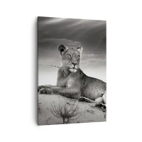 Vászonkép - Fekete-fehér portré egy oroszlánról a szavannán - 70x50cm - A sivatagi királynő pihenése - Modern fali dekoráció nappalihoz és hálószobához ARTTOR