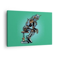 Vászonkép - Pop art stílusú gondolkodó robot zöld háttérrel - 70x50cm - A lét lényege fölött - Modern fali dekoráció nappalihoz és hálószobához ARTTOR