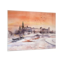 Üveg kép - Naplemente a királyi vár és a folyó felett télen - 70x50cm - Királyi naplemente - Modern fali dekoráció nappalihoz és hálószobához ARTTOR
